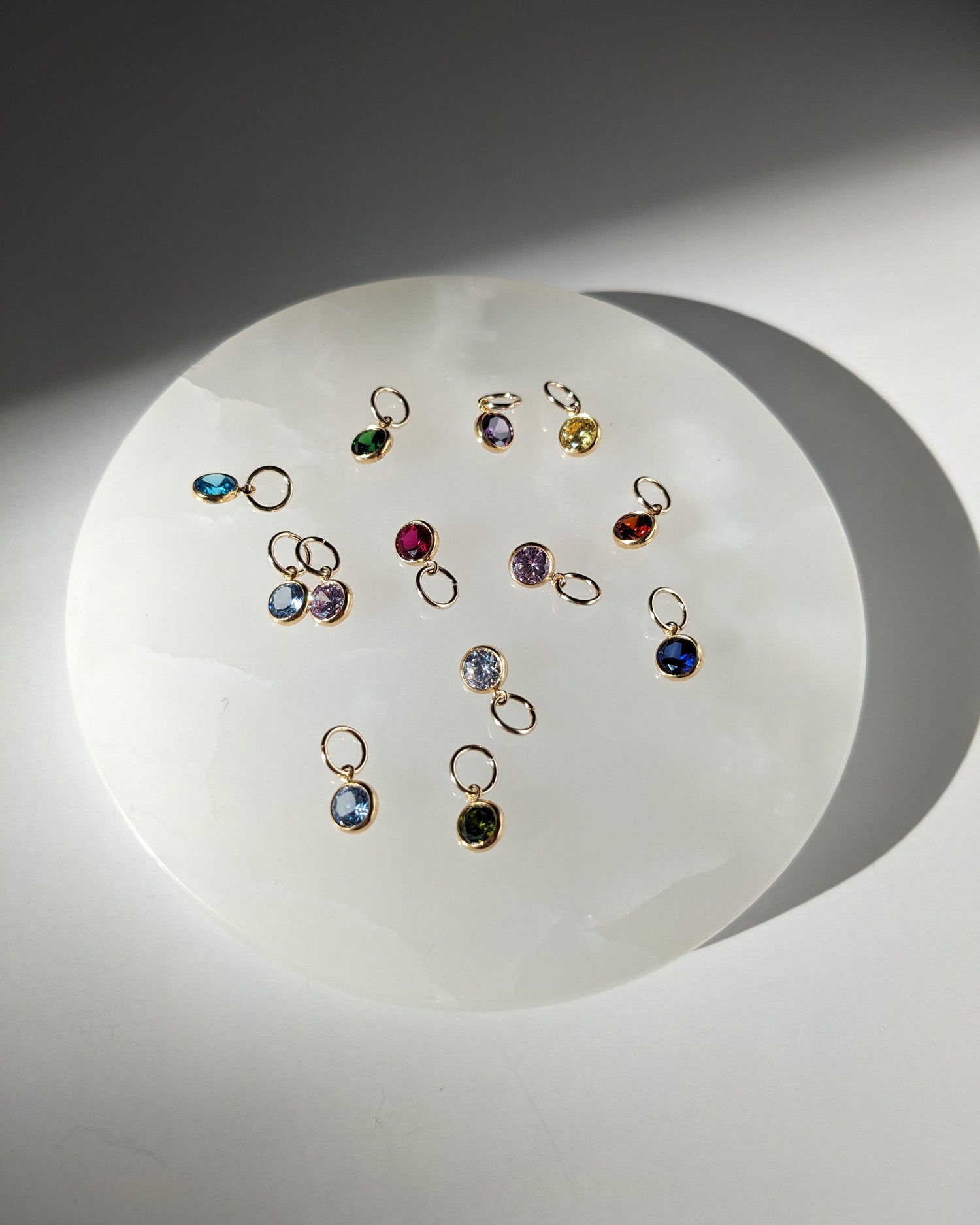 Personalize your stack with our dainty birthstone charms. Each charm features a jewel toned stone to symbolize each birth month. Add to your favorite piece or start your charm stack with our charm starter chain.