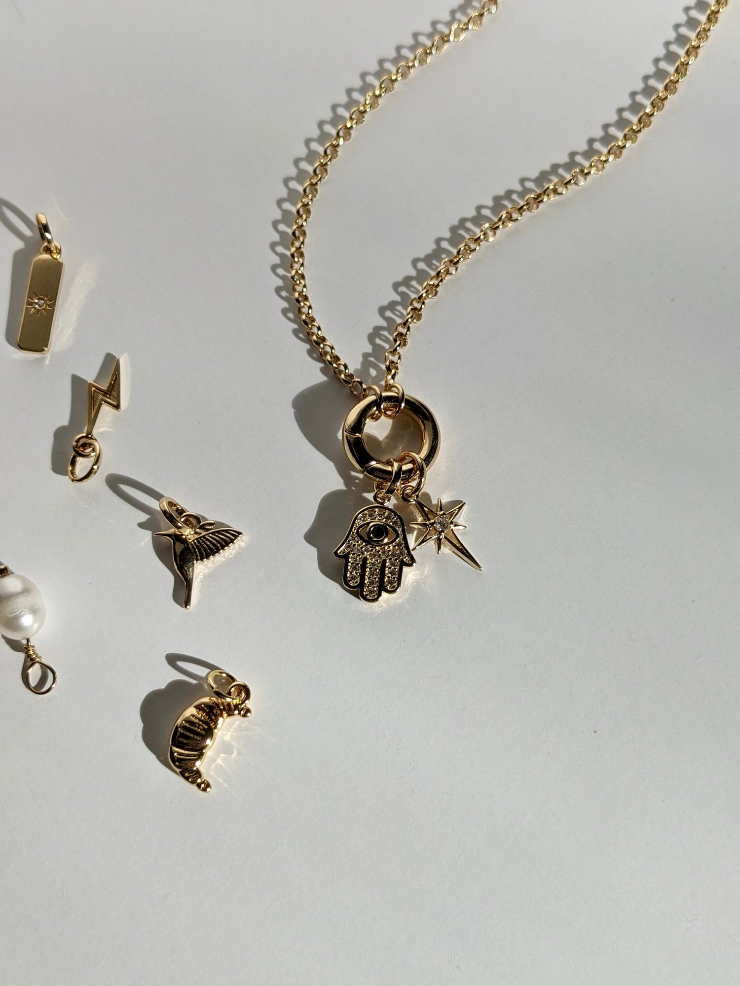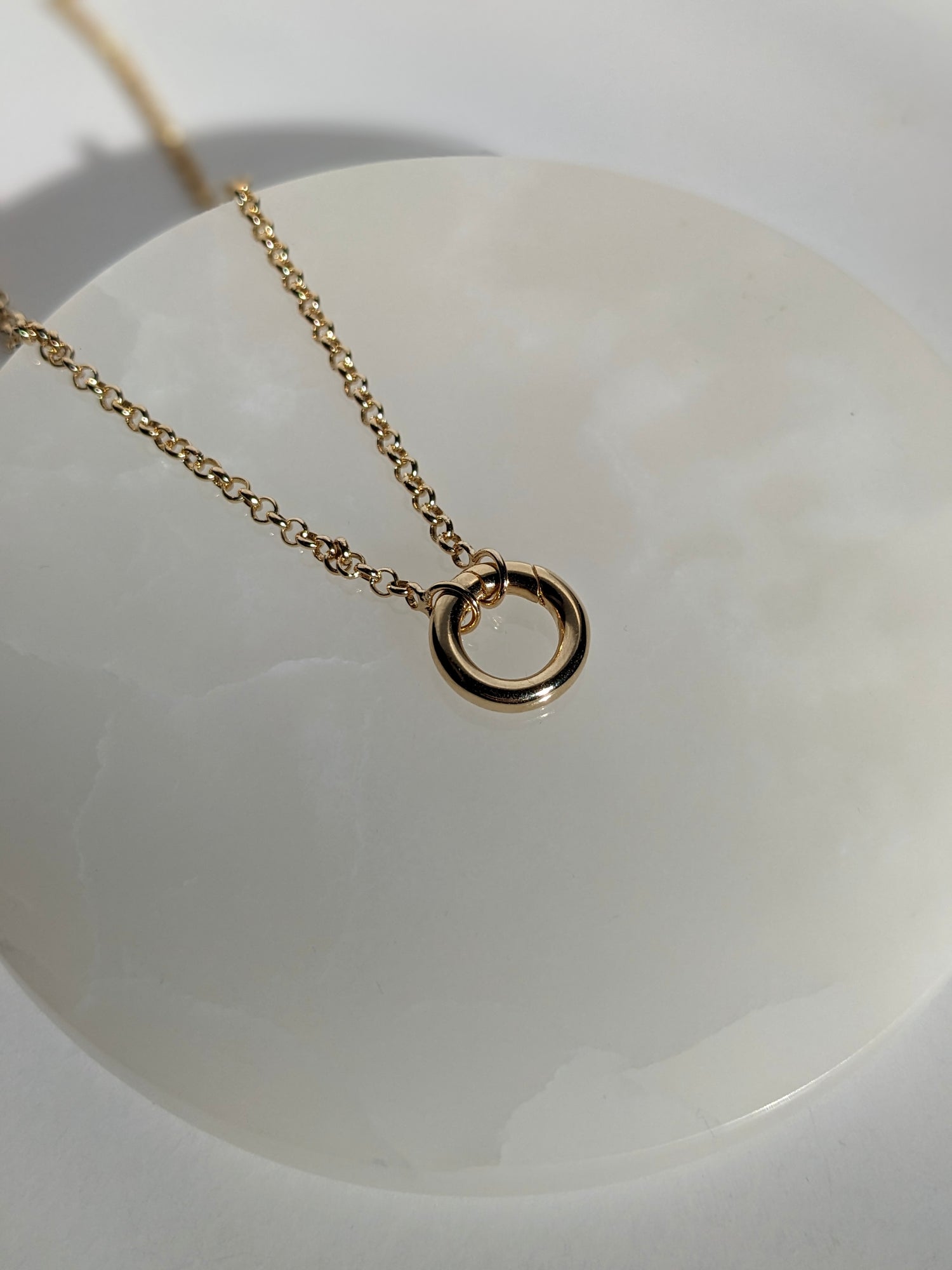 Start your charm necklace collection with our Charm Starter Necklace, featuring a round carabiner clasp and rollo chain. You can wear it solo or layer on the charms.